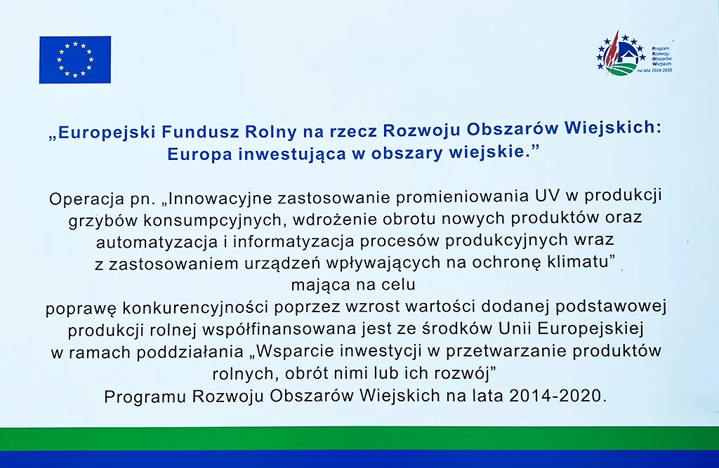 East Mushrooms Sp. z o.o.realizuje Projekt Polskie Mosty Technologiczne współfinansowany z Europejskiego Funduszu Rozwoju Regionalnego w ramach III Osi priorytetowej Wsparcie innowacji w przedsiębiorstwach, Działanie: 3.3.